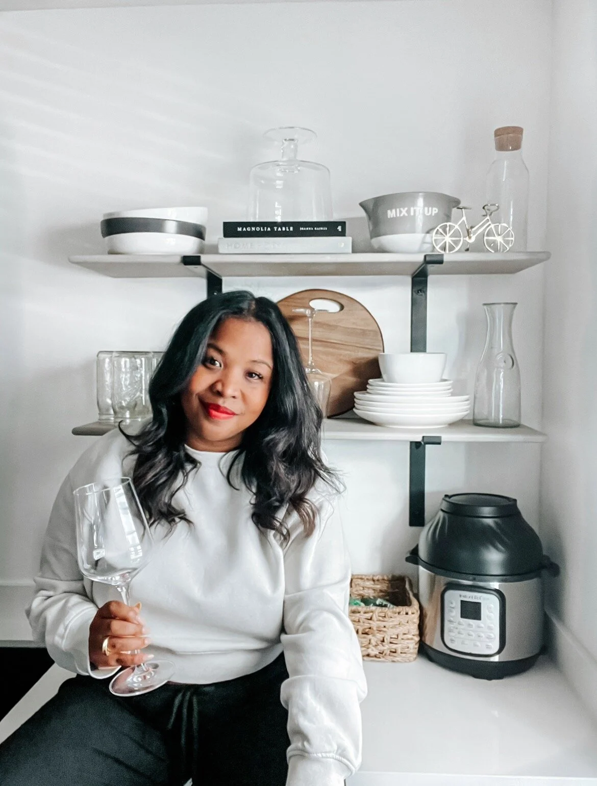 But, back to the shelves... One of my favorite things about open shelving is styling! I guess you can attribute that to my former days of visual merchandising at West Elm. But more importantly, open shelving makes it super easy to find and grab whatever you need! It can be a little challenging if you have OCD like me and prefer things to match, But that’s nothing a $20 basic white dish set from target can’t fix!
