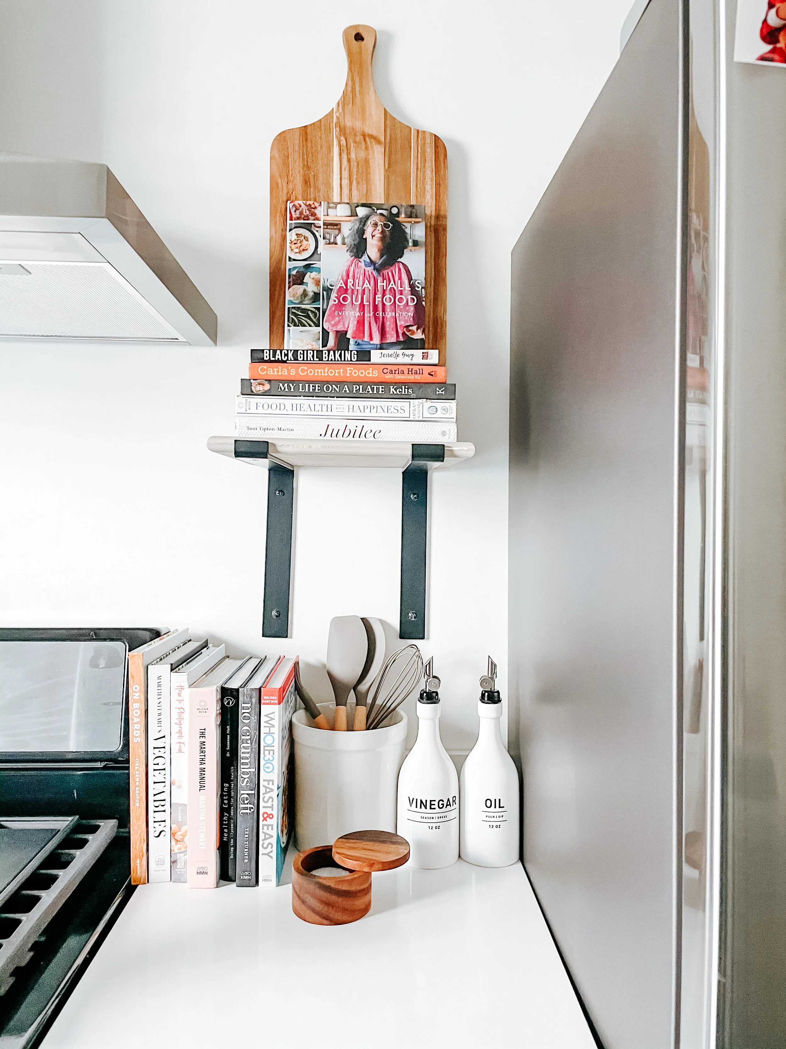 Let’s talk about open kitchen shelving! I’ve always admired kitchens with open shelving and was super excited when I toured my now new apartment and saw shelves instead of cabinets. It’s kind of what sold me. Well... that and the soft close cabinets, the gas range stove, the dishwasher...